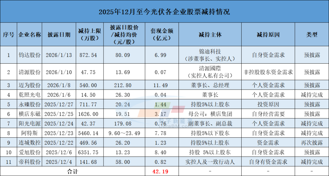 据数字新能源DataBM.com不完全统计,除上述企业外,已有爱旭股份(600732)、横店东磁(002056)、阿特斯等多家光伏企业股东也接连宣布了减持计划,若按上市公司公告披露日收盘价计算,拟套现总额超40亿元。