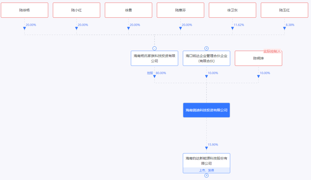 股权穿透显示,锦迪科技大股东为海南杨氏家族科技投资有限公司,持股80%,成员包括陆徐杨、陆小红、徐勇、陆惠芬、徐卫东、陆玉红。值得关注的是,陆徐杨正是钧达股份董事长,陆小红、徐勇则为公司实控人。