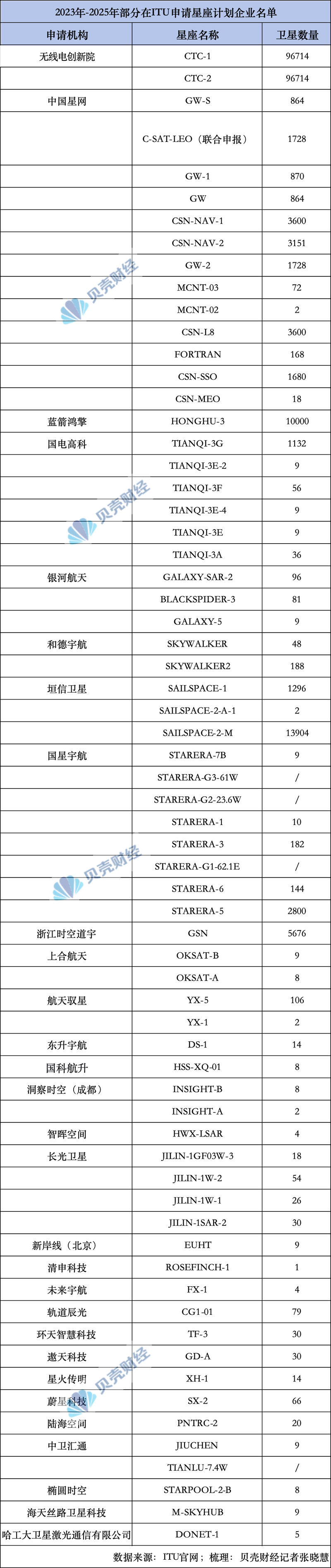 据新京报贝壳财经记者不完全梳理,目前,中国星网、上海垣信、蓝箭鸿擎、无线电创新院向ITU(国际电信联盟)提交的星座规模均达到10000颗卫星以上;2023年以来,我国共有超过60家机构向ITU申报卫星资料,行业覆盖范围极其广泛,既有中国星网、上海垣信、中国卫通(601698)等央国资背景企业,也有清华大学、北京大学、中科院、鹏城国家实验室等科研力量,还有蓝箭鸿擎、银河航天、长光卫星、国星宇航等庞大的商业航天队伍。