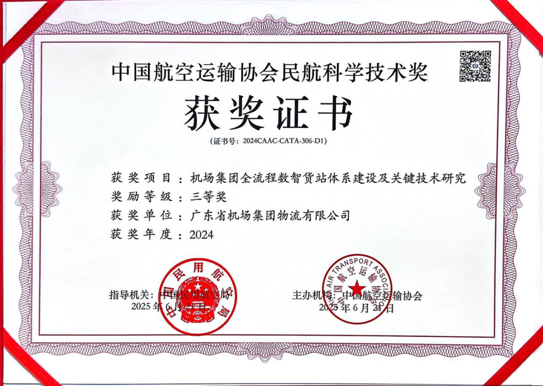 2025年6月,机场集团全流程数智货站体系建设及关键技术研究项目,荣获“中国航空运输协会民航科学技术奖三等奖”。