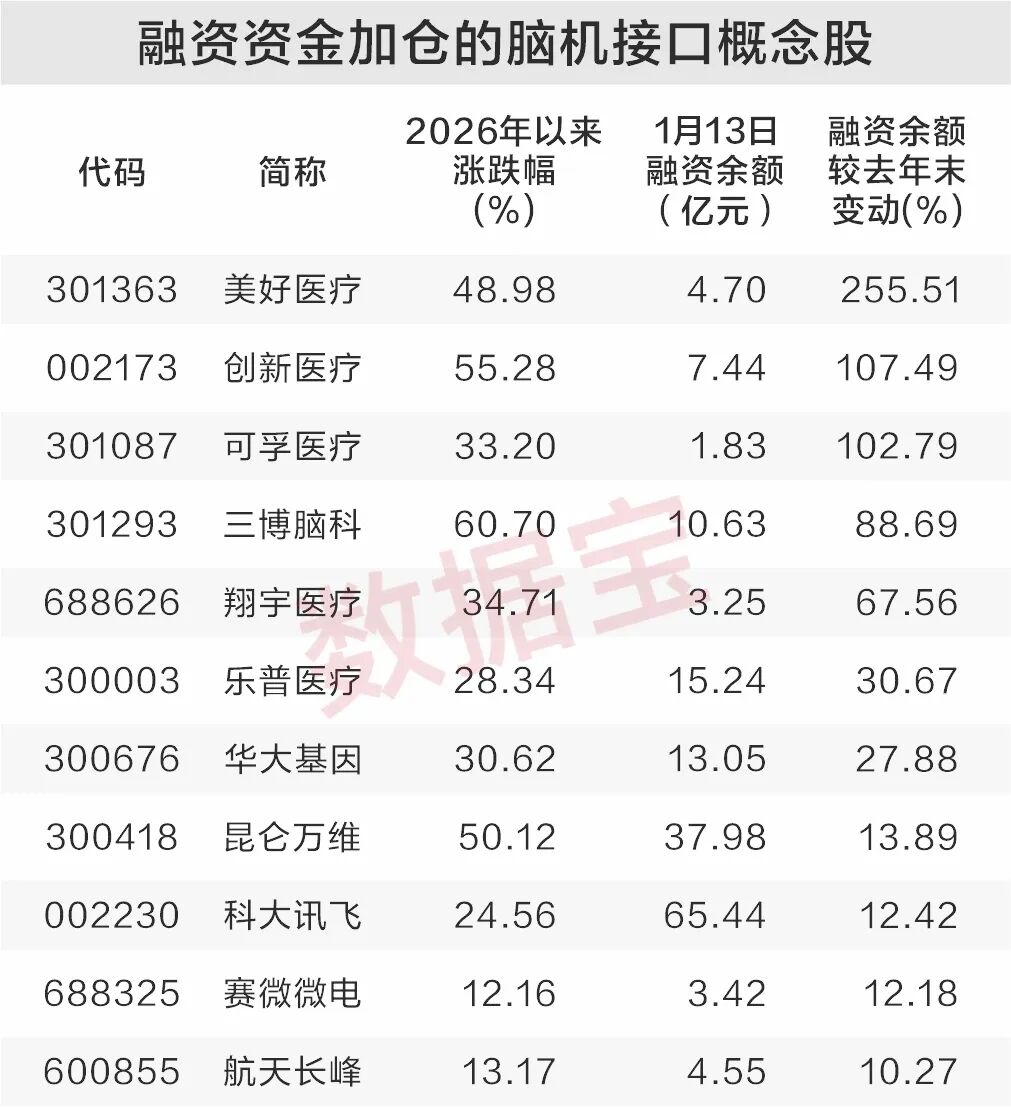 从融资资金来看,据证券时报·数据宝统计,截至1月13日,脑机接口26只概念股中,有19只属于融资融券标的,最新融资余额合计近255亿元,与去年末相比增加超过15%,其中17只个股获加仓,11只加仓幅度超过10%。