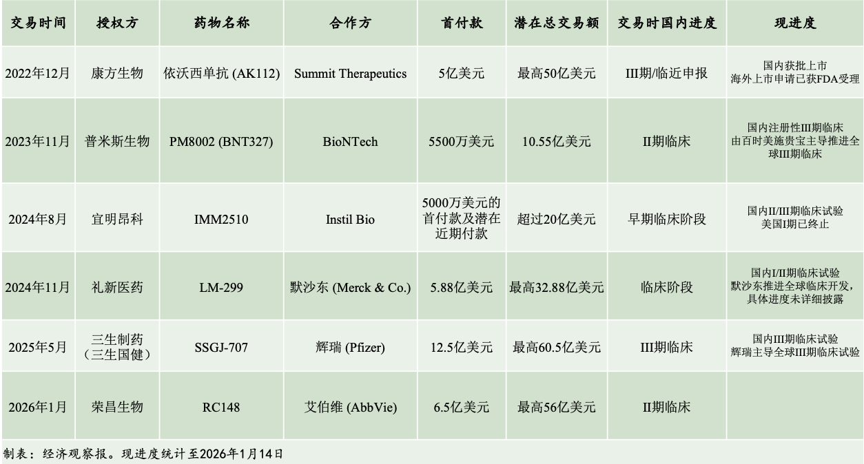 此外,2026年1月6日,宜明昂科宣布终止与Instil Bio的交易,收回了其PD-L1/VEGF药物的海外权益。宜明昂科这项交易在2024年8月达成,当时约定首付款及潜在近期付款为5000万美元,里程碑付款有望超过20亿美元。但截至协议终止,宜明昂科仅收到3500万美元,不足其余公开交易首付款的十分之一,且开发进度停滞。