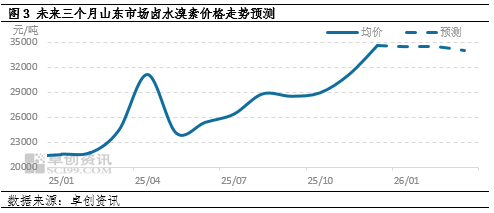 2026年一季度,基于溴素季节性波动规律,预计价格整体呈稳中下行趋势。1-2月溴素生产企业多处于停产状态,整体现货供应有限,下游行业传统淡季,需求亦减少,供需博弈下,预计溴素市场僵持为主。3月春节假期过后,溴素厂陆续开工,叠加新投产装置逐渐稳定出货,场内溴素供应增量,听闻下游阻燃剂生产企业多持有原料或成品库存,年后开工初期或无明显需求增加,溴素市场供过于求概率较大,市场价格窄幅下跌的可能性较大。预计2026年1月份均价34500元/吨,价格预期在34000-36000元/吨波动,2026年2月份均价34500元/吨,3月份均价34000元/吨。