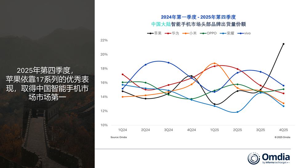 Omdia:2025 年中国大陆智能手机市场微幅下滑 1%,华为时隔五年重夺第一