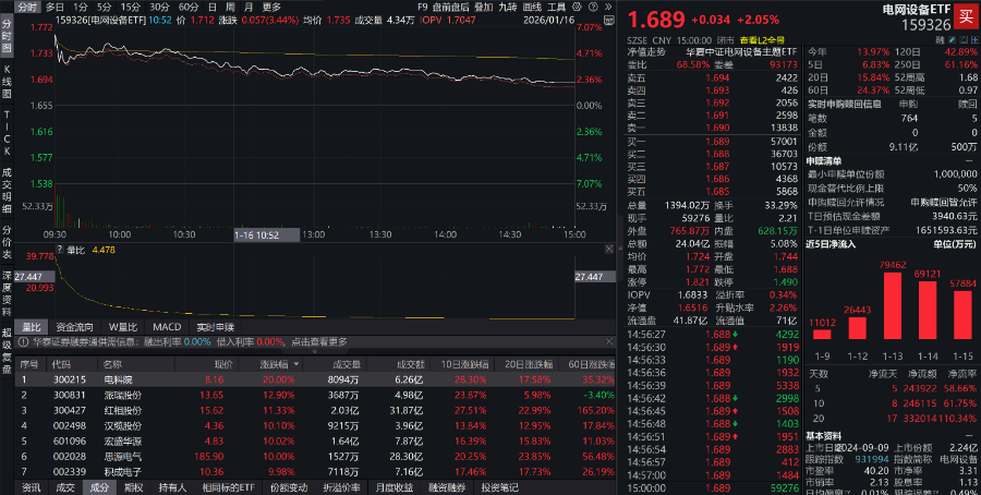 消息迅速传导至资本市场。1月16日,电网设备ETF开盘涨幅一度超过6%,全天涨2.05%,电科院(300215)(300215.SZ)、汉缆股份(002498)(002498.SZ)、思源电气(002028)(002028.SZ)、积成电子(002339)(002339.SZ)等多股涨停,派瑞股份(300831)(300831.SZ)、红相股份(300427)(300427.SZ)等成分股涨超10%。
