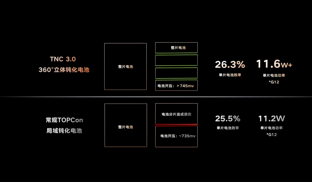 这些技术并非各自独立发挥作用,而是围绕同一效率目标进行匹配与配合,使电池在分片、封装并进入组件应用后,仍能保持稳定、高效的性能释放,为TNC3.0在系统层面的效能提升奠定基础。