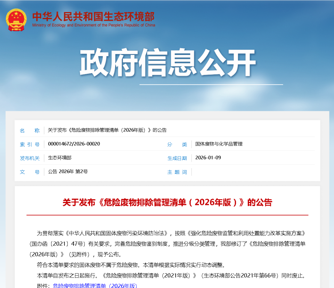《危险废物排除管理清单(2026年版)》最新发布,与已实施的豁免清单共塑行业合规新格局