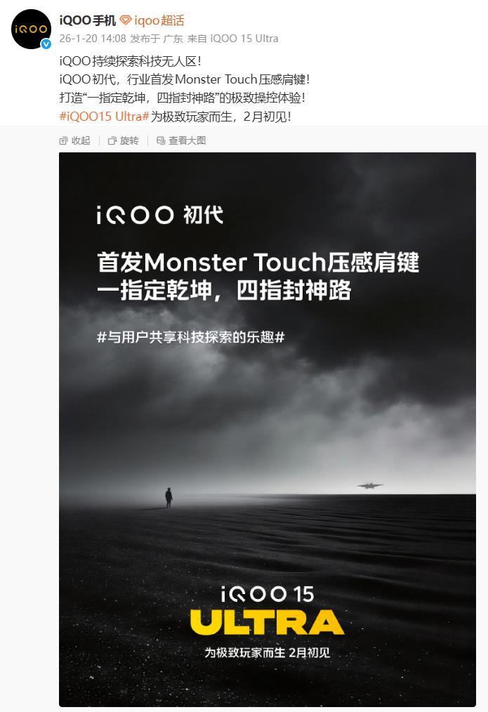 iQOO 回顾初代产品行业首发 Monster Touch 压感肩键,15 Ultra 新机宣称「重塑操控极限」