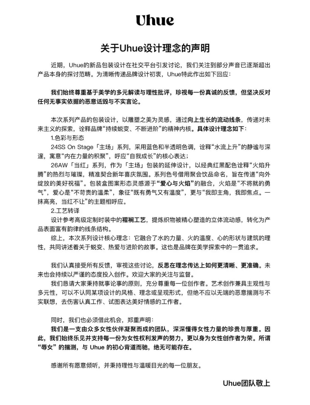 面对争议,品牌方Uhue发布声明回应称“始终尊重基于美学的多元解读与理性批评,珍视每一份真诚的反馈,但坚决反对任何无事实依据的恶意诋毁与不实言论。”