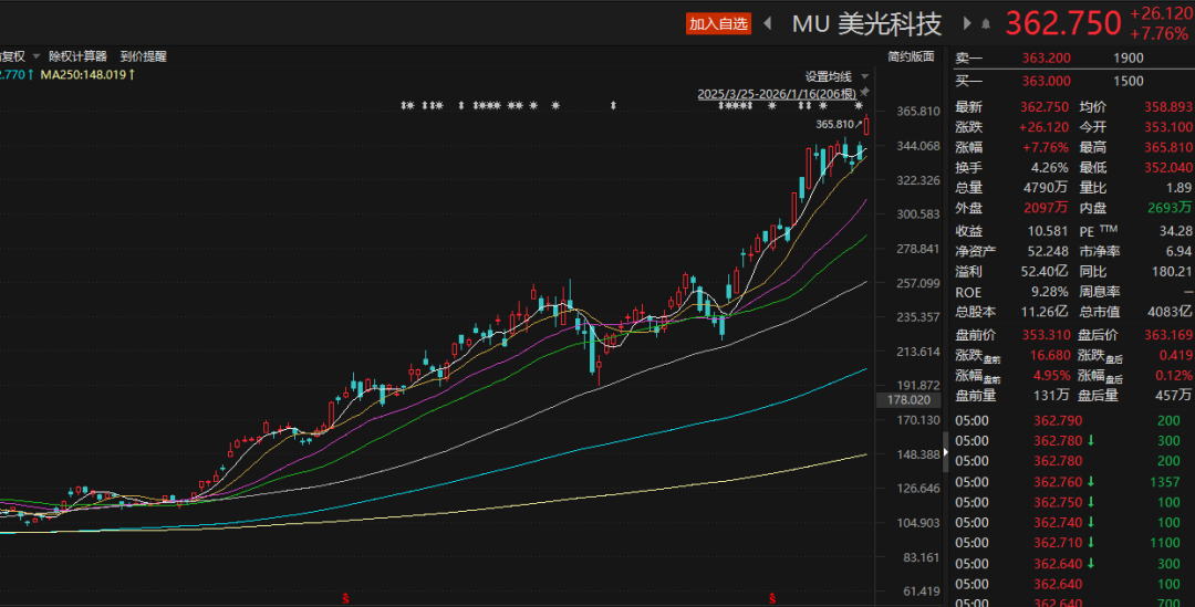 去年以来至今,美股市场多只存储芯片股票走出惊人的上涨行情,大幅跑赢纳斯达克指数。以美光科技为例,该股去年8月起股价如同坐上火箭,从100美元左右涨至362.75美元,总市值超过4000亿美元。