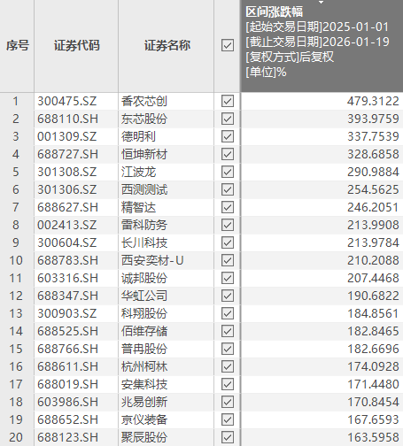 A股市场中,多只存储芯片行业个股去年以来也呈现强劲上涨。数据显示,截至1月19日,香农芯创(300475)、东芯股份、德明利(001309)、江波龙(301308)等10余只个股去年以来涨幅均超过200%。