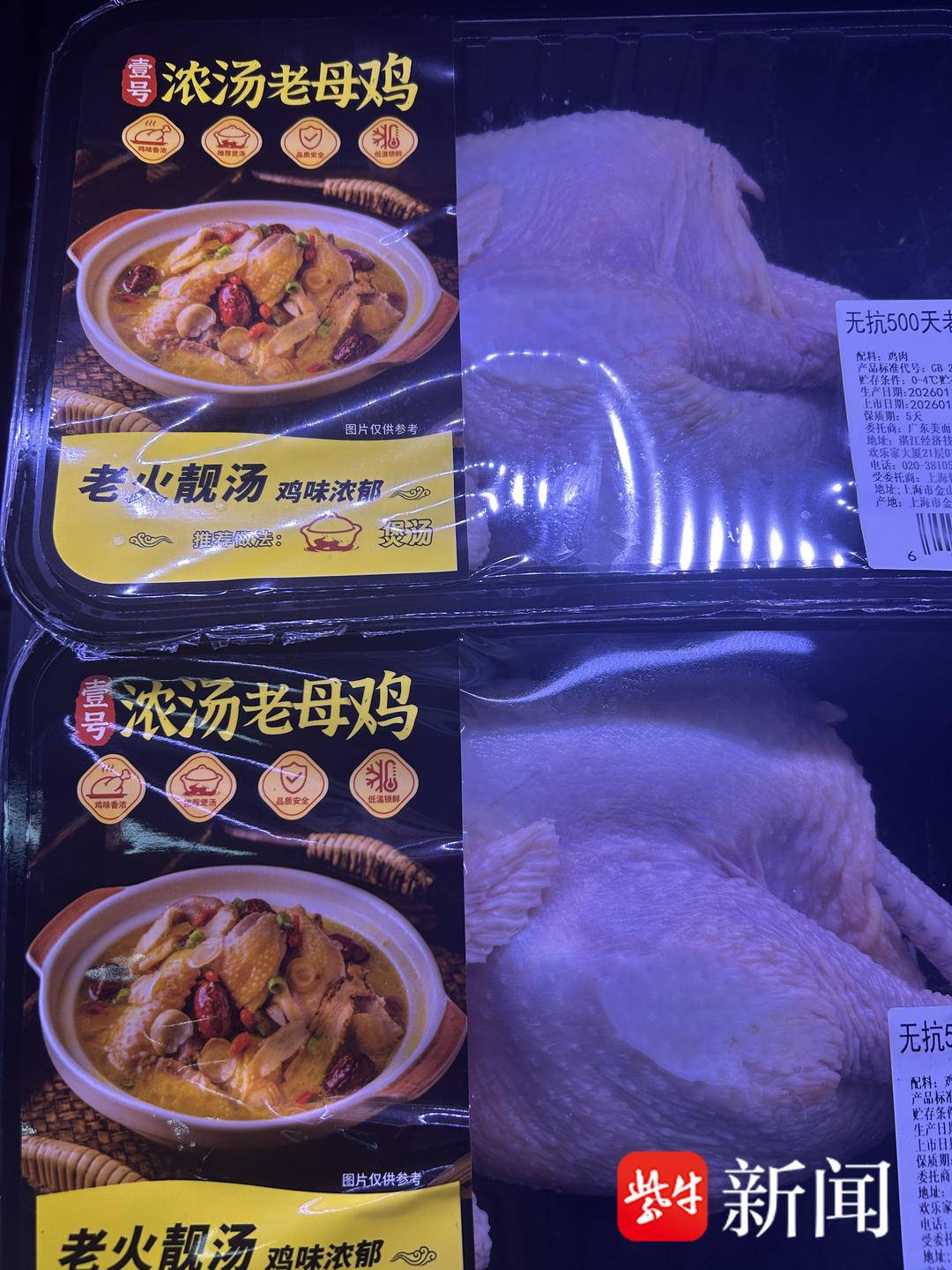在河西一家大型超市里,冷冻区与冰鲜肉禽区则丰富得多,价格差异也非常大。冷冻区,一只标注散养500天的皖南土鸡黄油老母鸡,重约1公斤,售价29.9元。旁边另一只标明“慢养180天”的黄羽土鸡,同样1公斤重,同样是冷冻品,价格翻至59.9元。而一款1.1公斤的“有机散养母鸡”,价格高达168元。冰鲜区内,一只重1.25公斤的“冰鲜无抗500天老母鸡”售价45.9元,旁边还有无抗岭南山林土鸡、冰鲜小公鸡、无抗散养童子鸡等不适合煲汤的品类,产地、品牌、饲养方式各不相同,但均比有机散养母鸡要便宜不少。