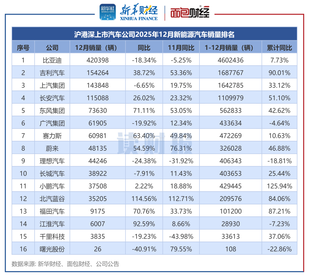 数据显示,比亚迪、上汽集团、吉利汽车的12月新能源汽车销量分别为42.04万辆、15.43万辆、14.38万辆,位居前三。增速方面,北汽蓝谷同比增速超过100%,江淮汽车、东风集团、福田汽车增速超过70%;理想汽车、曙光股份等销量同比降幅超过20%。