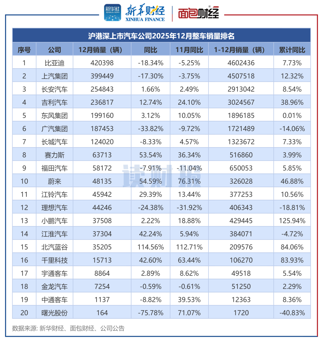 数据显示,12月,比亚迪以月销42.04万辆位居第一,上汽集团、长安汽车(000625)、吉利汽车紧随其后。同比增速方面,北汽蓝谷12月整车销量同比增速超过100%,蔚来、赛力斯增速超过50%;广汽集团(601238)、曙光股份销量同比下降超过30%。