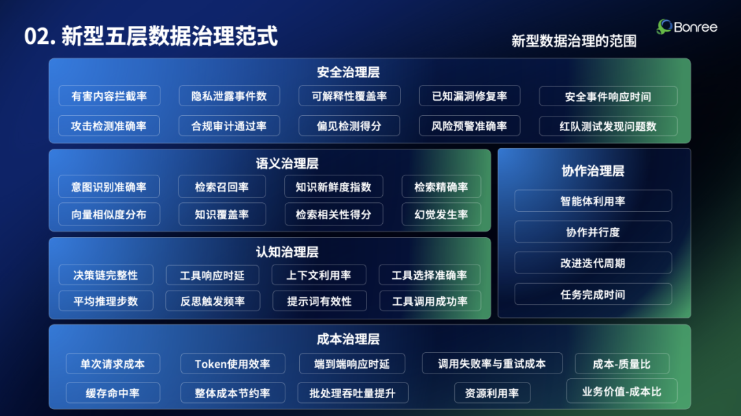 这五个层面并非孤立存在,而是形成协同治理体系:认知层+语义层共同决定输出质量,协作层通过智能体编排提升整体效能,成本层约束资源使用追求最优性价比,安全层贯穿所有层面提供基础保障。