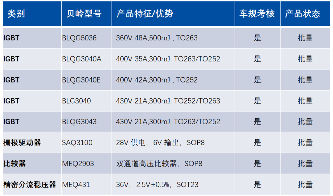 值得一提的是,依托已实现批量销售的BLG3040、BLQ3040A等系列发动机点火IGBT产品,上海贝岭已成功构建起“驱动+功率”的汽车发动机点火组合产品方案。
