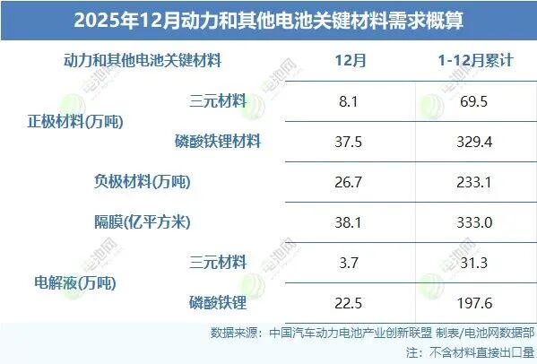 2025年,我国动力和储能电池用三元材料69.5万吨,磷酸铁锂材料329.4万吨;负极材料233.1万吨;隔膜333.0亿平方米;三元电池用电解液31.3万吨,磷酸铁锂电池用电解液197.6万吨。