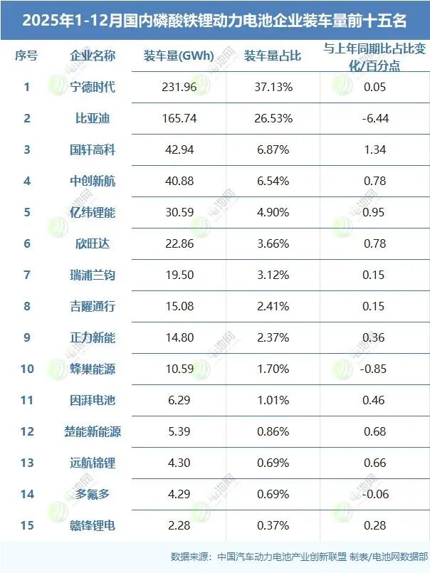 宁德时代、比亚迪、国轩高科、中创新航、亿纬锂能、欣旺达、瑞浦兰钧、吉曜通行、正力新能、蜂巢能源、因湃电池、楚能新能源、远航锦锂、多氟多、赣锋锂电上榜“2025年国内磷酸铁锂动力电池企业装车量TOP15”。
