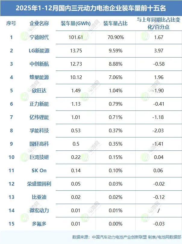 宁德时代、LG新能源、中创新航、蜂巢能源、欣旺达、正力新能、亿纬锂能、孚能科技、国轩高科、巨湾技研、SK On、荣盛盟固利(301487)、比亚迪、微宏动力、多氟多上榜“2025年国内三元动力电池企业装车量TOP15”。