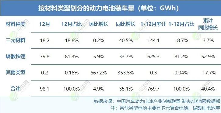 磷酸铁锂电池:全年装车量625.3GWh,占比81.2%,同比增长52.9%。
