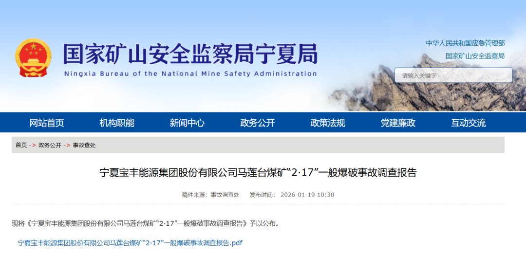 1月19日,国家矿山安全监察局宁夏局公布了《宁夏宝丰能源集团股份有限公司马莲台煤矿“2.17”一般爆破事故调查报告》。