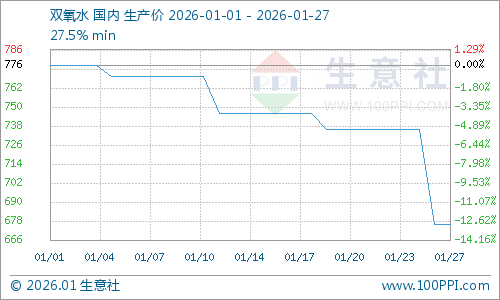 据生意社商品分析系统数据显示:1月双氧水行情走弱,不断下跌,跌幅超12%。月初,双氧水市场均价776元/吨,1月27日,双氧水价格676元/吨,下跌12.88%。