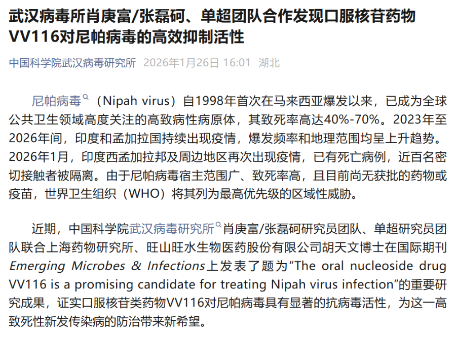 不过,中国科学院武汉病毒研究所官微披露,肖庚富/张磊砢研究员团队、单超研究员团队联合上海药物研究所、旺山旺水生物医药股份有限公司胡天文博士在国际期刊Emerging Microbes & Infections上发表了题为“The oral nucleoside drug VV116 is a promising candidate for treating Nipah virus infection”的重要研究成果,证实口服核苷类药物VV116对尼帕病毒具有显著的抗病毒活性,为这一高致死性新发传染病的防治带来新希望。
