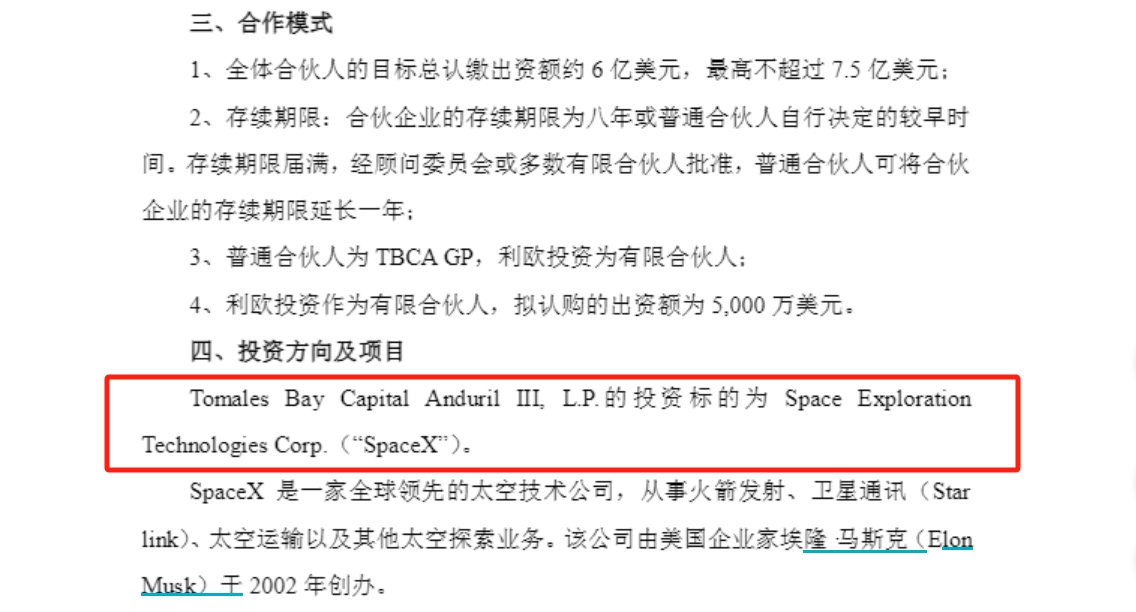 2021年11月,利欧股份发布公告称,全资子公司Leo Investments HongKong Limited(以下简称“利欧投资”)签署了《Agreement of Limited Partnershipof Tomales Bay Capital Anduril III, L.P.》,对Tomales Bay Capital Anduril III, L.P.(以下简称“TBCA”)出资5000万美元。TBCA投资的投资标的正是Space Exploration Technologies Corp.(“SpaceX”)。