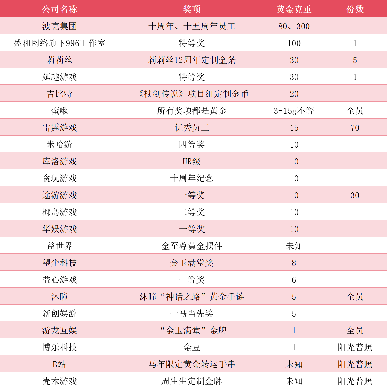 第二种是把黄金作为大奖放进抽奖池,克数一般较大。比如盛和网络旗下996工作室,特等奖为100克黄金。莉莉丝、延趣游戏的特等奖是30克金条,米哈游、途游游戏、库洛游戏、椰岛游戏分别抽10克金条。