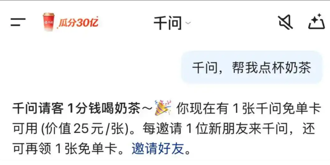 2月6日,千问App正式启动“春节30亿免单”活动。随着首轮“请喝奶茶”福利上线,全国多地奶茶店出现订单激增、排队爆单的现象。据@千问 发布消息:活动上线5小时下单超过500万单。据极目新闻,全国多地的奶茶门店爆单,有的门店甚至排到了1400多杯。
