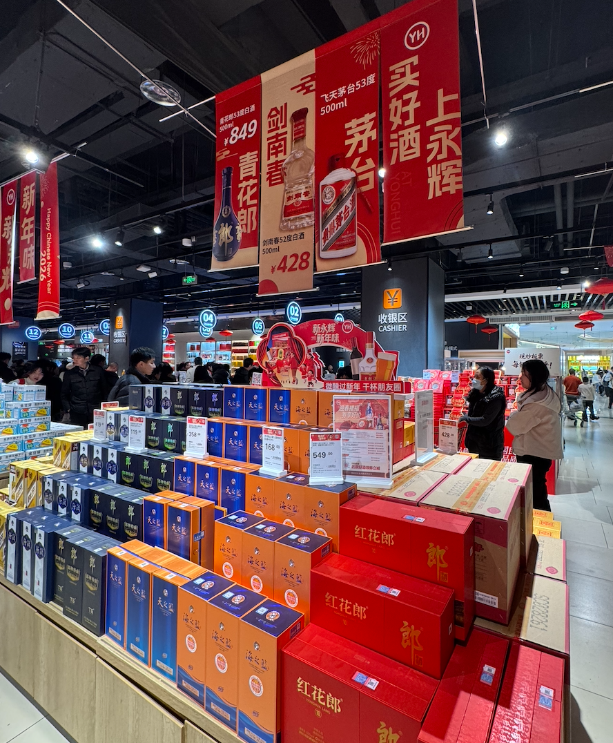 在重庆两江新区一家学习胖东来调改后的永辉超市(601933),21世纪经济报道记者在现场看到,店内打出了“买名酒 上永辉”的标语,消费者在永辉超市线上小程序领券后可优惠购买郎酒、泸州老窖、汾酒等名酒的多款产品。