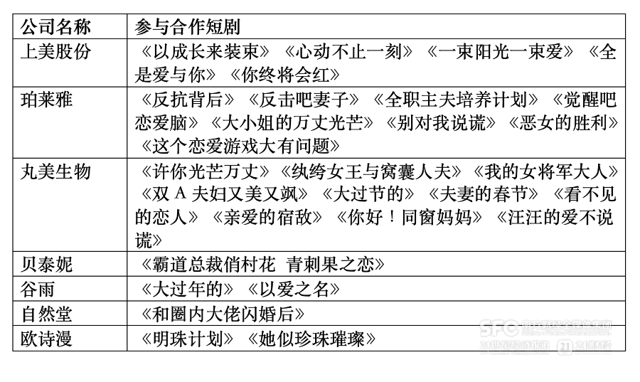事实上,看重短剧庞大的用户基数和流量,珀莱雅(603605)(603605.SH)、上美股份(02145.HK)、丸美生物(603983)(603983.SH)、贝泰妮(300957)(300957.SZ)等美妆公司已纷纷下场,在霸总、甜宠、复仇等各类型短剧中,悄然植入自家产品。