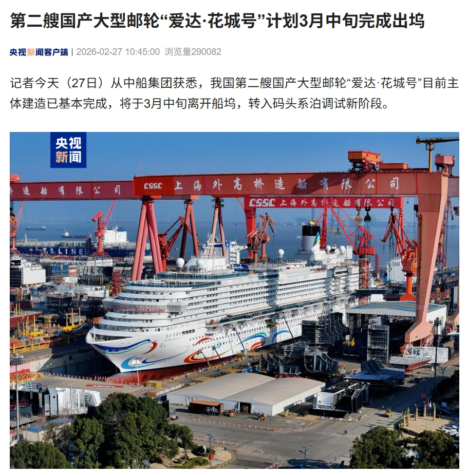 第二艘国产大型邮轮“爱达 · 花城号”计划 3 月中旬完成出坞