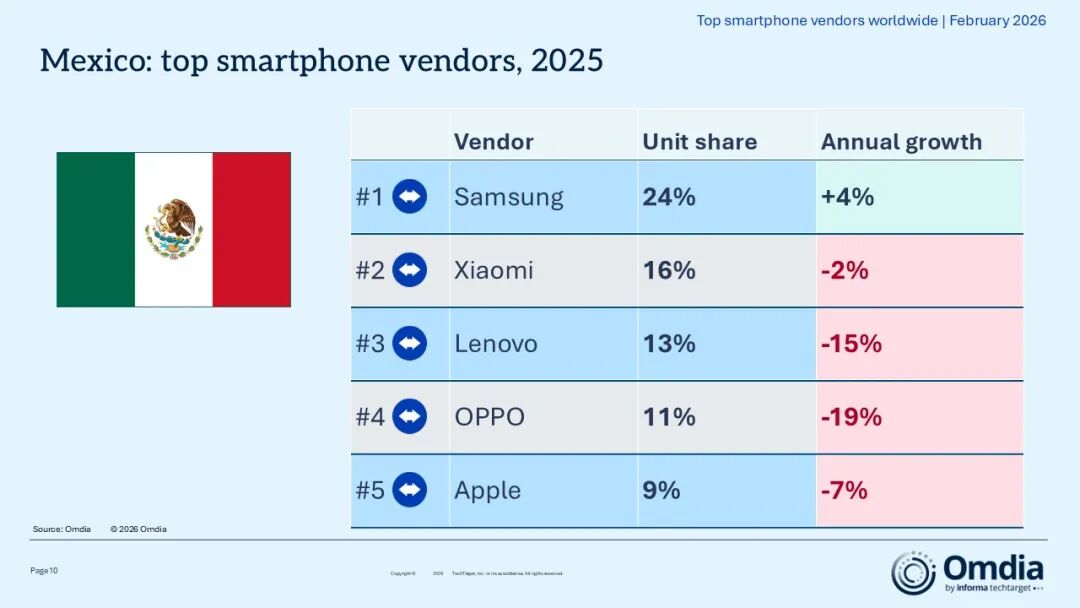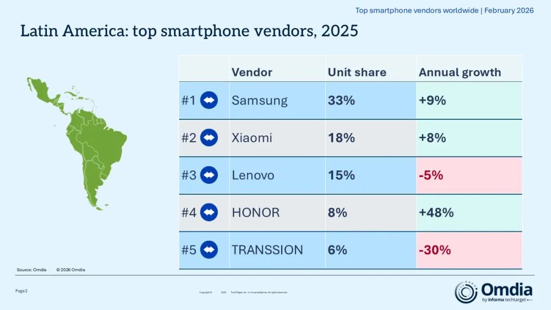 3月3日,Omdia发布2025年全球智能手机重点市场厂商排名。2025年,全球智能手机出货量增长2%,达到12.5亿部,为2021年以来的最高水平。除大中华区外,各地区出货量均同比增长,中国内地则因2025年国家补贴政策的激励效应不及预期而略有下降。升级和换机的强劲需求支撑使市场保持增长,尽管商业环境充满不确定性,多家厂商仍然打破了纪录。