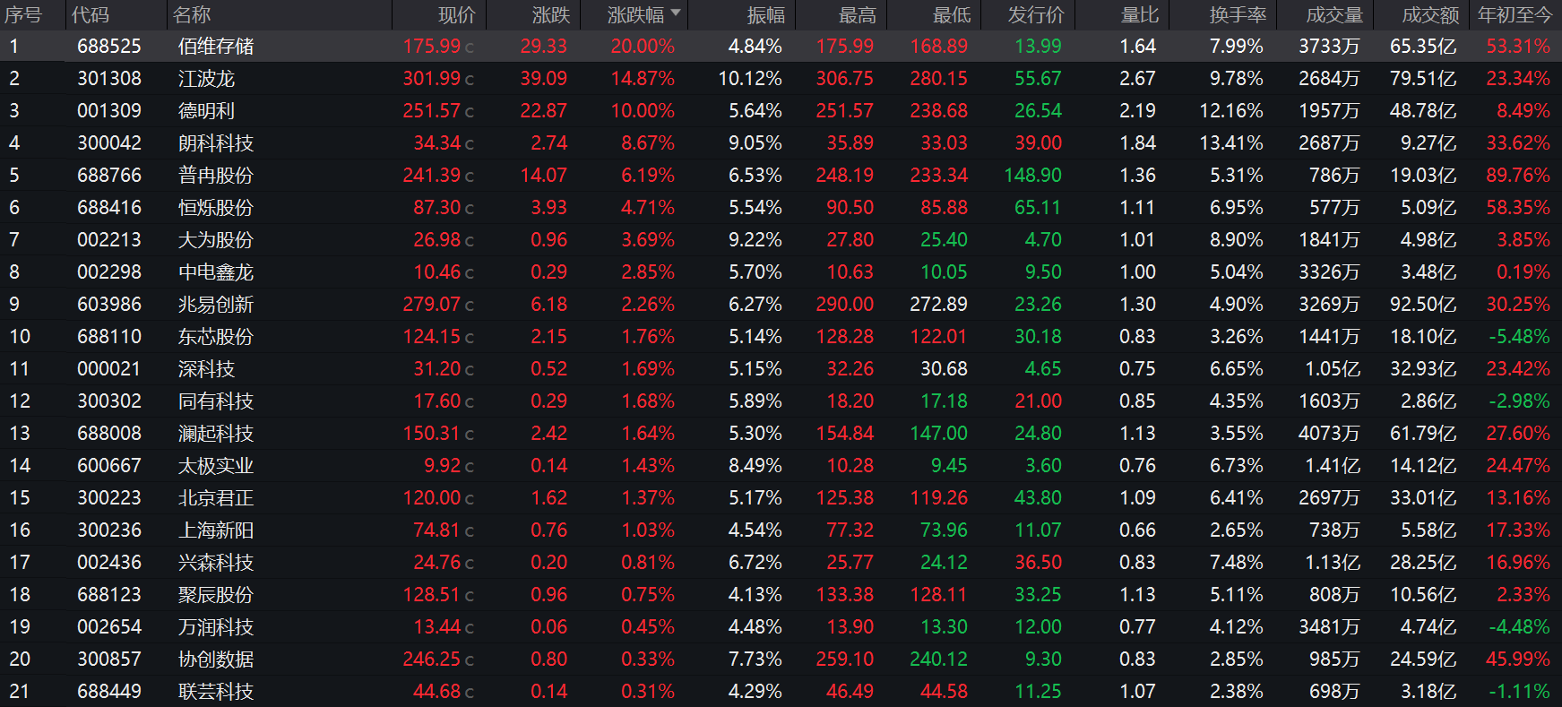 年初业绩暴增9倍!佰维存储“20cm”领涨存储板块,江波龙、德明利、朗科科技等多股强势跟涨