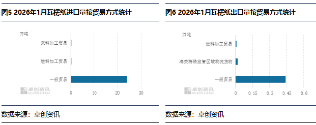 2026年1月瓦楞纸进口量、出口量按贸易方式统计