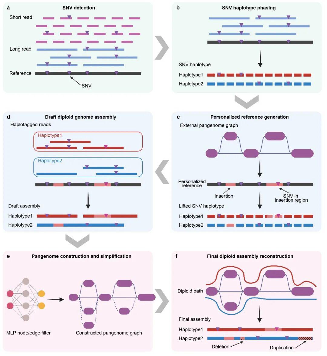 团队提出了一套基于泛基因组的联合组装(PIGA)方法。该方法充分利用高性价比的混合测序策略(包含中等深度的短读长和长读长测序),实现了对大规模人群二倍体基因组的联合组装。