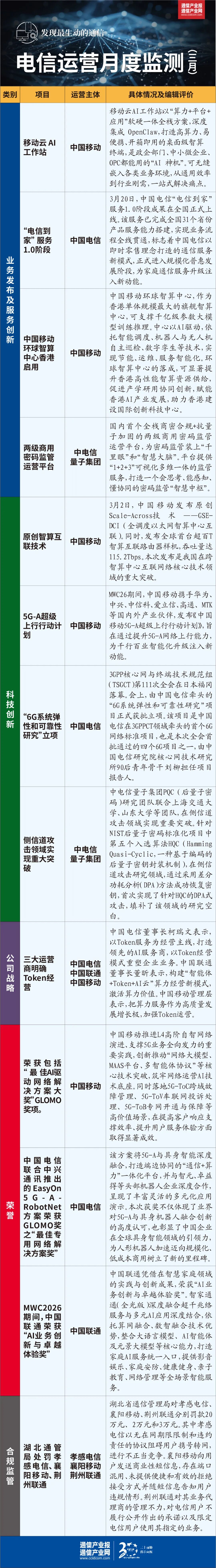 3月电信市场呈现出技术创新纵深突破、业务场景创新、战略方向聚焦、合规监管持续强化的特征。三大运营商与产业链企业,在AI终端、5g(885556)-A、量子安全等领域多点开花,同时行业监管持续筑牢合规底线,推动电信行业从“流量经营”向“价值经营”的深度转型。