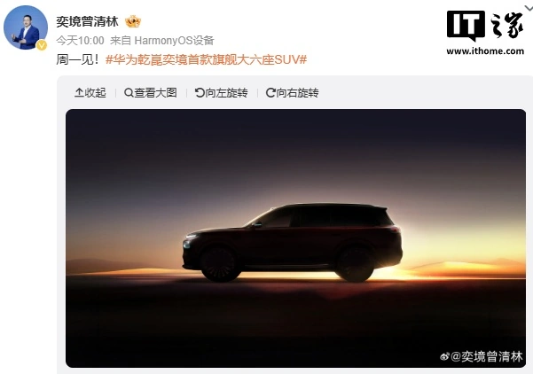 IT之家4月17日消息,今日,奕境汽车品牌总经理曾清林在社交媒体上发布了一张奕境首款旗舰大六座SUV预告图,并表示“周一见(4月20日)”。