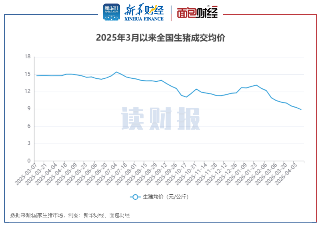根据国家生猪市场披露的数据,全国生猪成交均价自2026年2月以来出现单边下滑,自3月底生猪成交均价下探至10元/公斤以下,4月初跌至8.88元/公斤,创下近十年新低纪录。