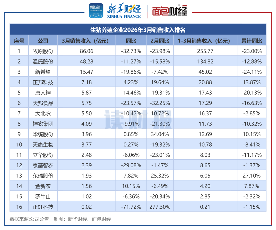 2026年3月,16家上市生猪养殖(884275)企业合计销售收入达195.34亿元(傲农生物(603363)未披露收入数据)。其中,牧原股份(002714)、温氏股份(300498)、新希望(000876)3月销售收入超过10亿元。