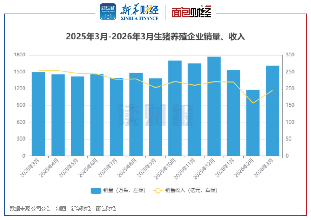 图2:2025年3月-2026年3月生猪养殖企业销量、收入