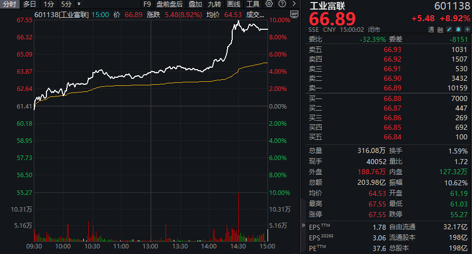 近期市场热点概念CPO、光通信模块今日再度表现抢眼,板块内“涨声”一片。长光华芯(688048)、协创数据(300857)和东山精密(002384)午后收获涨停的同时股价纷纷创下历史新高。三大龙头股“易中天”今日成交额位居前列,榜首的新易盛(300502)午后持续走强,最终收涨7.64%,总市值突破6000亿元。万亿巨头工业富联(601138)午后盘中触及涨停,成交额超过200亿元,位居全市场第三。