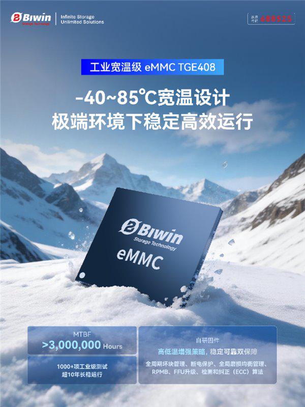 佰维存储(688525)TGE408eMMC采用自主研发的主控芯片、内置自研固件算法与本土NAND Flash颗粒,从芯片设计到流片制造实现全流程本土化,采用FBGA153Ball封装设计,遵循eMMC5.1协议并支持HS400高速模式,可在-40℃~85℃宽温域内稳定工作,搭配独家Win-pSLC超稳耐久架构,兼顾卓越性能、超高可靠性与超长耐久度,为电力能源(850101)、工业自动化等对稳定性要求严苛的领域,提供安全高效的数据存储解决方案。