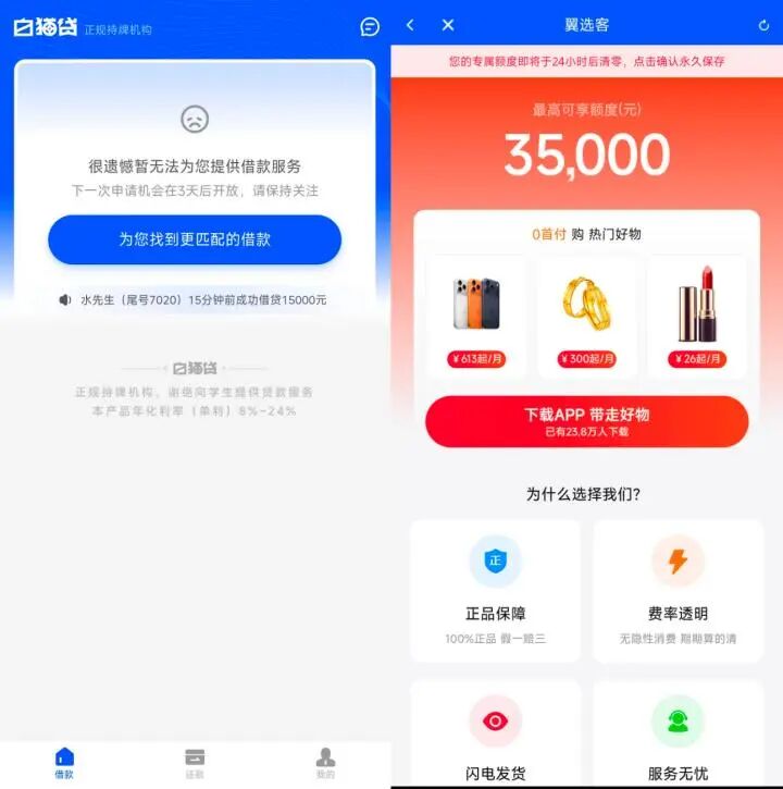 该平台对外宣称最高可借额度20万元,年化利率(单利)8.0%-24%,还提示“正规持牌机构,谢绝向学生提供贷款服务”。