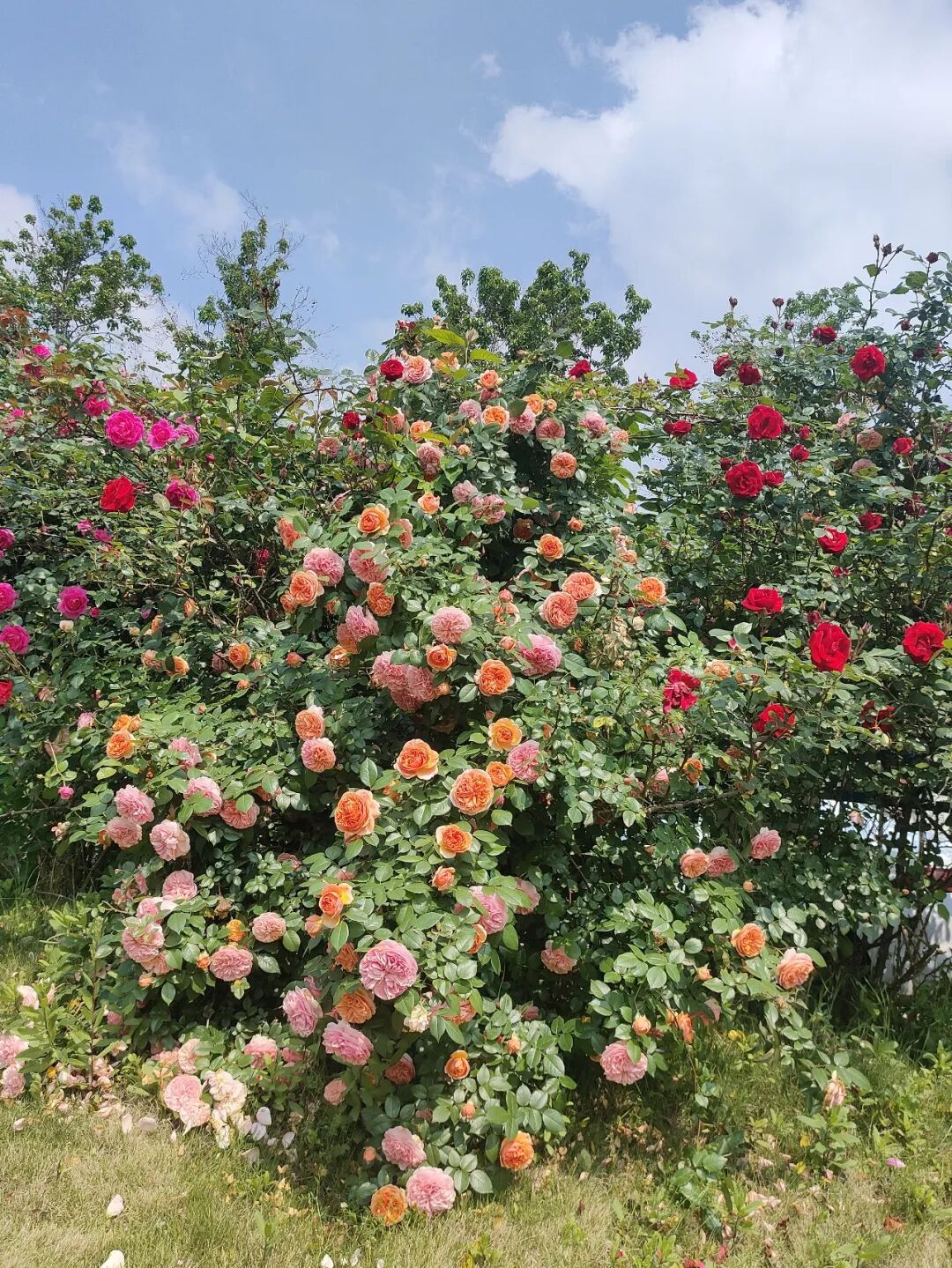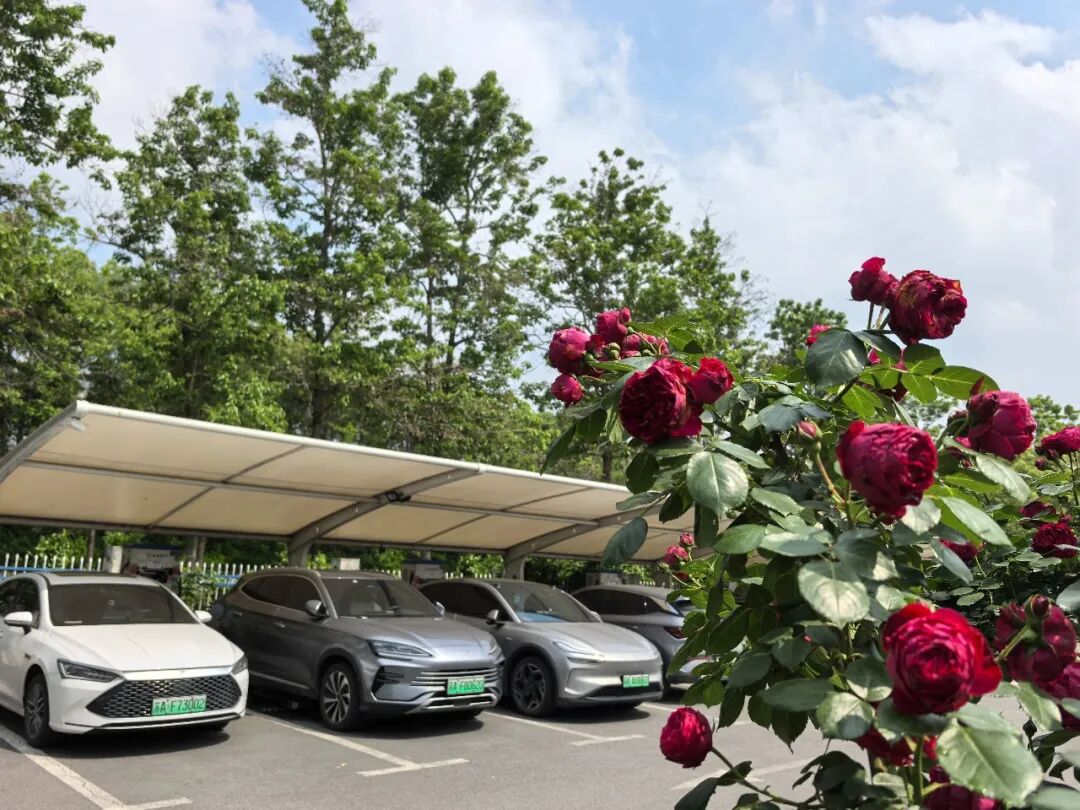 为了让每一位来到这里的顾客都能感受到这份自然之美,我们的工作人员精心挑选了多个品种的月季,从经典的藤本月季到珍稀的树状月季,每一株都承载着我们对美好生活的向往。经过悉心照料,如今它们已盛装登场,用绚丽的色彩和迷人的姿态,为充电站增添了一抹独特的风景。