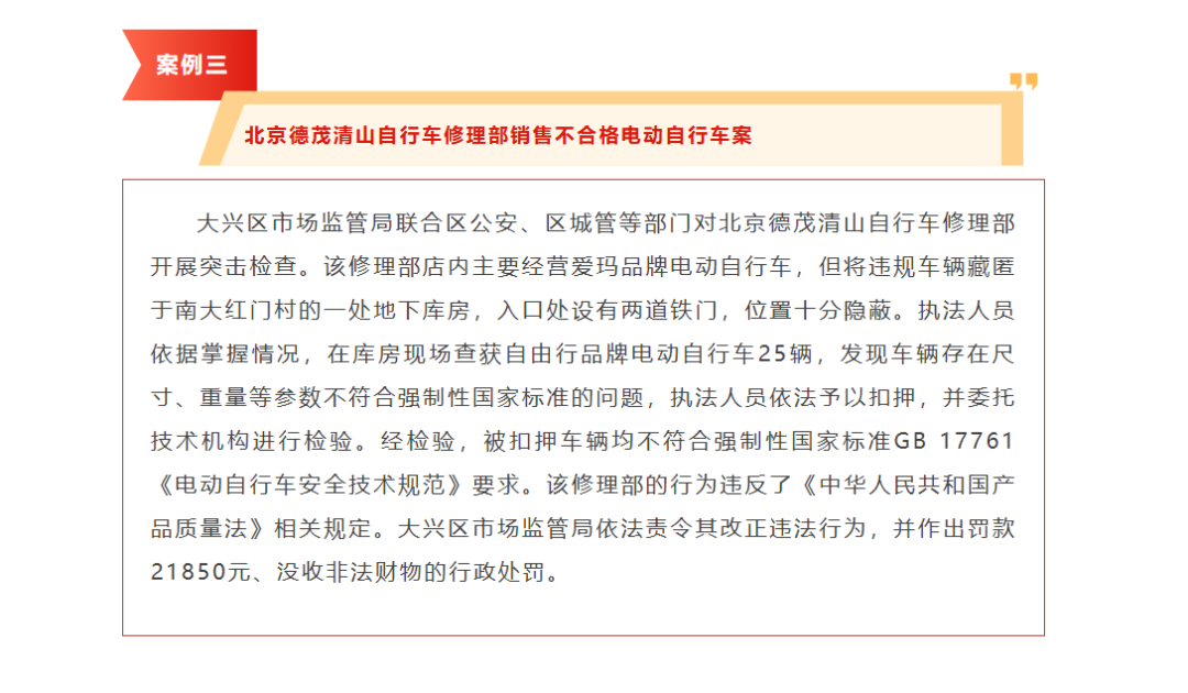 北京市市场监管局还公开曝光了一批超标改装违法行为典型案例。例如,有企业门店主要经营小牛品牌电动自行车,但店外北侧20米过道拐角处藏匿鸥倍、鸥鸽、自由行、赛鸽等其它品牌电动自行车共25辆,均存在尺寸、重量等参数不符合强制性国家标准的问题,执法人员依法予以扣押,并委托技术机构进行检验。经检验,被扣押车辆均不符合强制性国家标准GB 17761《电动自行车安全技术规范》要求。昌平区市场监管局依法责令其改正违法行为,并作出罚款30975元、没收非法财物的行政处罚。