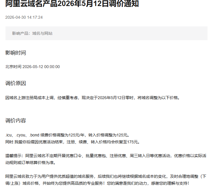 4月30日,阿里(BABA)云发布域名产品2026年5月12日调价通知。因域名上游注册局成本上调,经慎重考虑,阿里(BABA)云现决定于2026年5月12日零时,将域名调整为以下价格。调价内容:.icu、.cyou、.bond续费价格调整为125元/年,转入价格调整为125元。同时.我爱你后缀因优惠活动结束,注册、续费、转入价格均会恢复至175元。