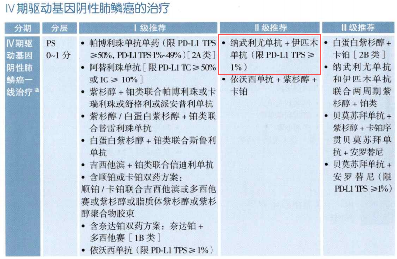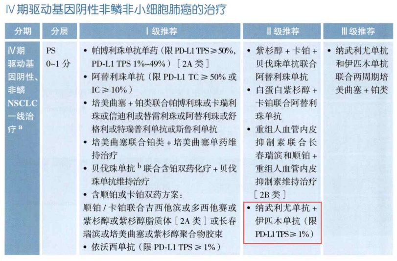 在此背景下,《指南》的一项更新尤为引人注目:在Ⅳ期无驱动基因非鳞NSCLC的一线治疗领域,纳武利尤单抗+伊匹木单抗(O+Y)方案被升级为Ⅱ级推荐(限PD-L1 TPS≥1%患者)。此前,国家药品监督管理局(NMPA)已正式批准O+Y方案用于PD-L1 TPS≥1%的晚期NSCLC一线治疗,使其成为中国首个肺癌一线双免疗法,填补了国内该领域的长期空白。此次《指南》推荐等级的升级,进一步确立了O+Y方案在晚期肺癌一线治疗中的重要地位,也标志着晚期NSCLC的一线治疗格局正稳步迈向“免化疗”的新时代。