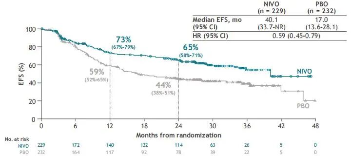CheckMate-77T研究的数据为这一指南升级奠定了坚实的循证基础[7]。中位随访33.3个月时,纳武利尤单抗组的主要终点中位无事件生存期(EFS)达40.1个月,较对照组(17.0个月)延长近两年,疾病进展、复发或死亡风险降低41%(HR=0.59)。